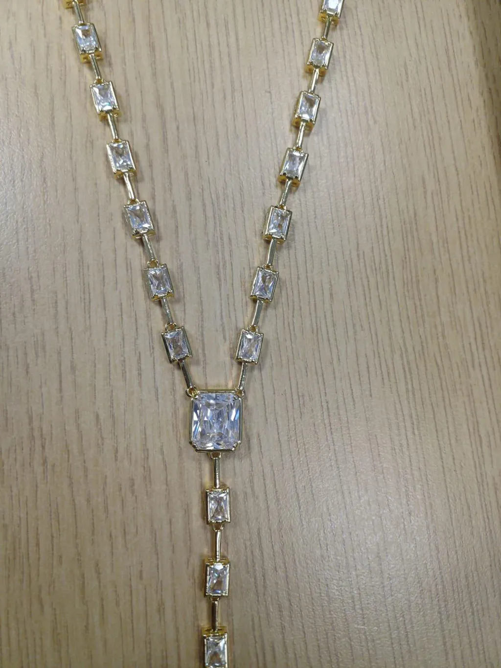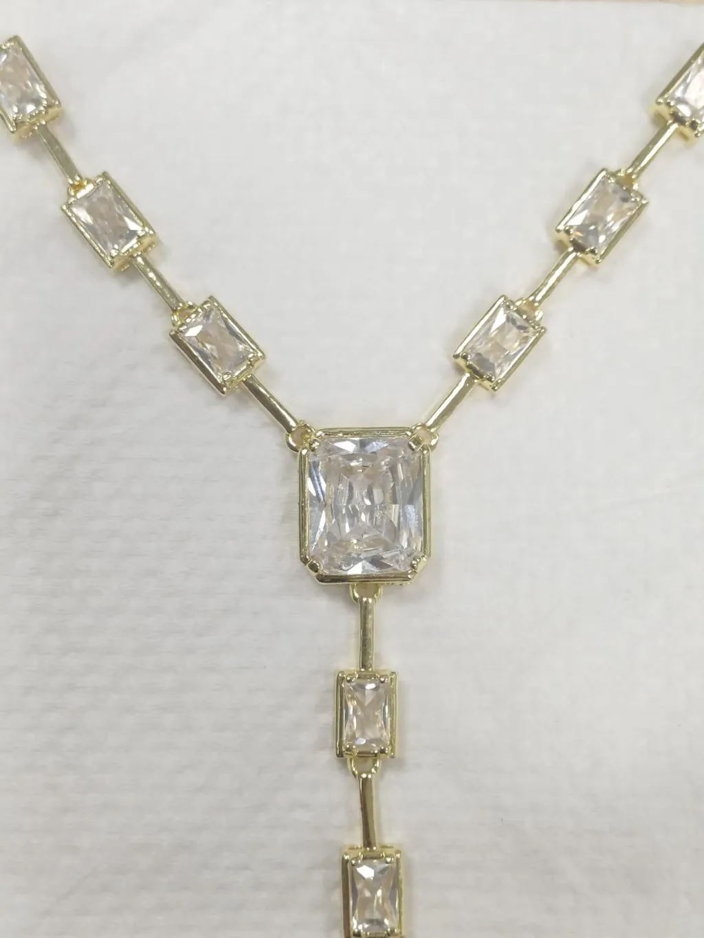 Elevate your evening look with this stunning 18k gold-plated Y-shaped necklace, designed to make every moment feel effortlessly glamorous. Crafted in premium brass with a long-lasting anti-tarnish coating, this piece features brilliant emerald-cut cubic zirconia stones that shimmer beautifully against the skin.